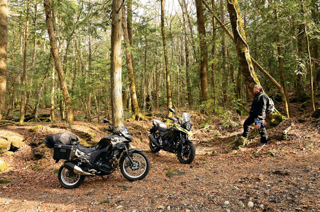 さて、賀曽利さんが乗るスズキ・Vストローム250と私が乗るカワサキ・ヴェルシス250Xツアラーを快適に飛ばし、賀曽利さんが主張する穴場ならぬ『人穴』という場所へとやってきた。2013年、富士山が世界文化遺産に認定され俄然注目されたのが富士信仰と富士講というものだ。賀曽利さんによると「世界遺産といっても富士山は白神山地のような自然が認定されたのではなくて、富士山信仰や富士講という文化が評価されて認定されたんだよね。富士山の周りには今も数えきれないほどの浅間神社が残されている」。江戸時代に起こった爆発的な富士信仰が脈々と現代にも受け継がれてきたからこそ、富士山は世界遺産になりえたわけだ。