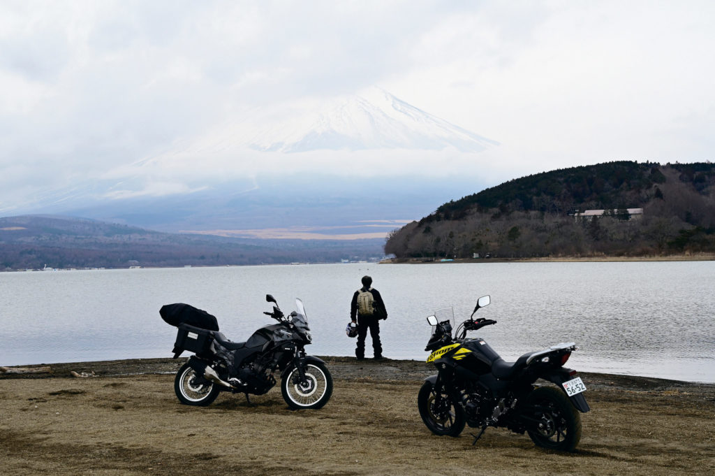 その後、再びVストローム250とヴェルシスX250にまたがった我々は国道139号線を東へと走り山中湖へと向かった。この国道139号線は青木ヶ原樹海を貫く道路で、別名・樹海道路と呼ばれている。約1200年前の富士山の大噴火で流れ出た溶岩が、それまで一つの巨大な湖だった場所に流れ込み富士五湖を形成したわけだが、その溶岩の上に出来たのが樹海なのである。なんともスケールの大きすぎる話ではあるが、地球規模では富士山の樹海というのはまだ若いものらしい。さて、賀曽利さんと私は山中湖に到着し、湖岸へとバイクを停めた。時間的には夕暮れ時なので、雲がなければ、夕日を背にした富士山と赤く染まる湖が見れるはずだが、今日はトコトンお預けだ。そしてどこまでも前向きな賀曽利さんは「いや〜これもまたすばらしい光景だよね」と笑うのだった。